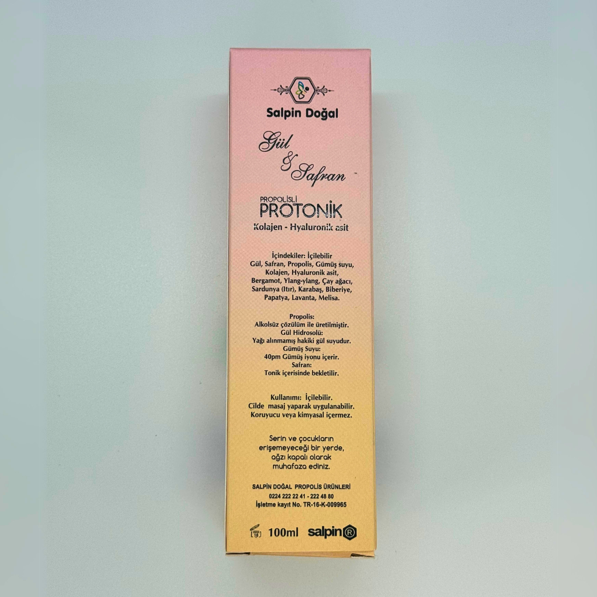 - Propolis, gümüş suyu, gül hidrosolü, safran ve değerli stres giderici aromaterapik yağlar karışımı PROTONİK Salpin Doğal Propolis Ürünleri bünyesindeki tüm ürünler gibi doğal ve içilebilir bir tonik formülize ettik. ?Hem cilt temizliği, güzelliği, bakımı ve onarımı